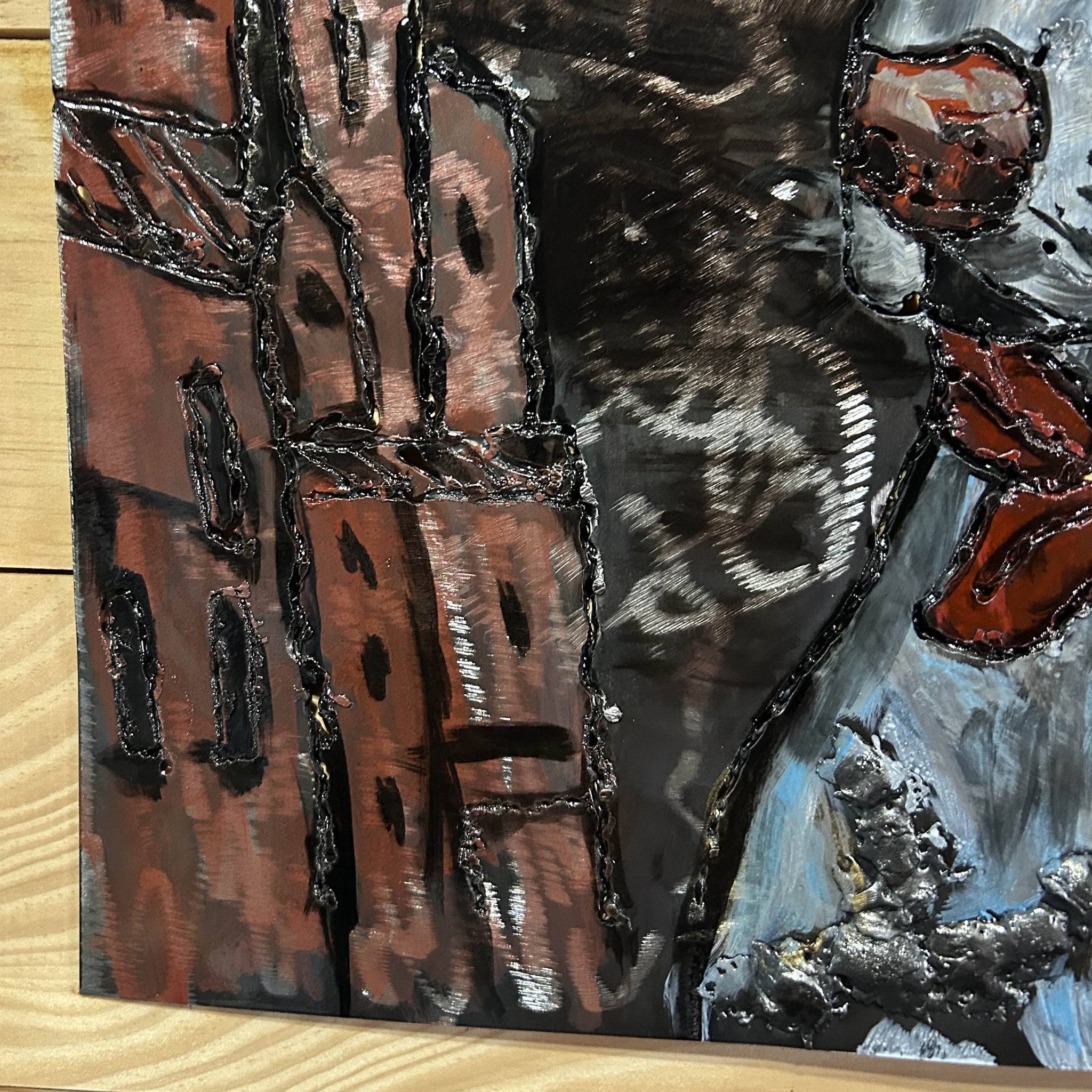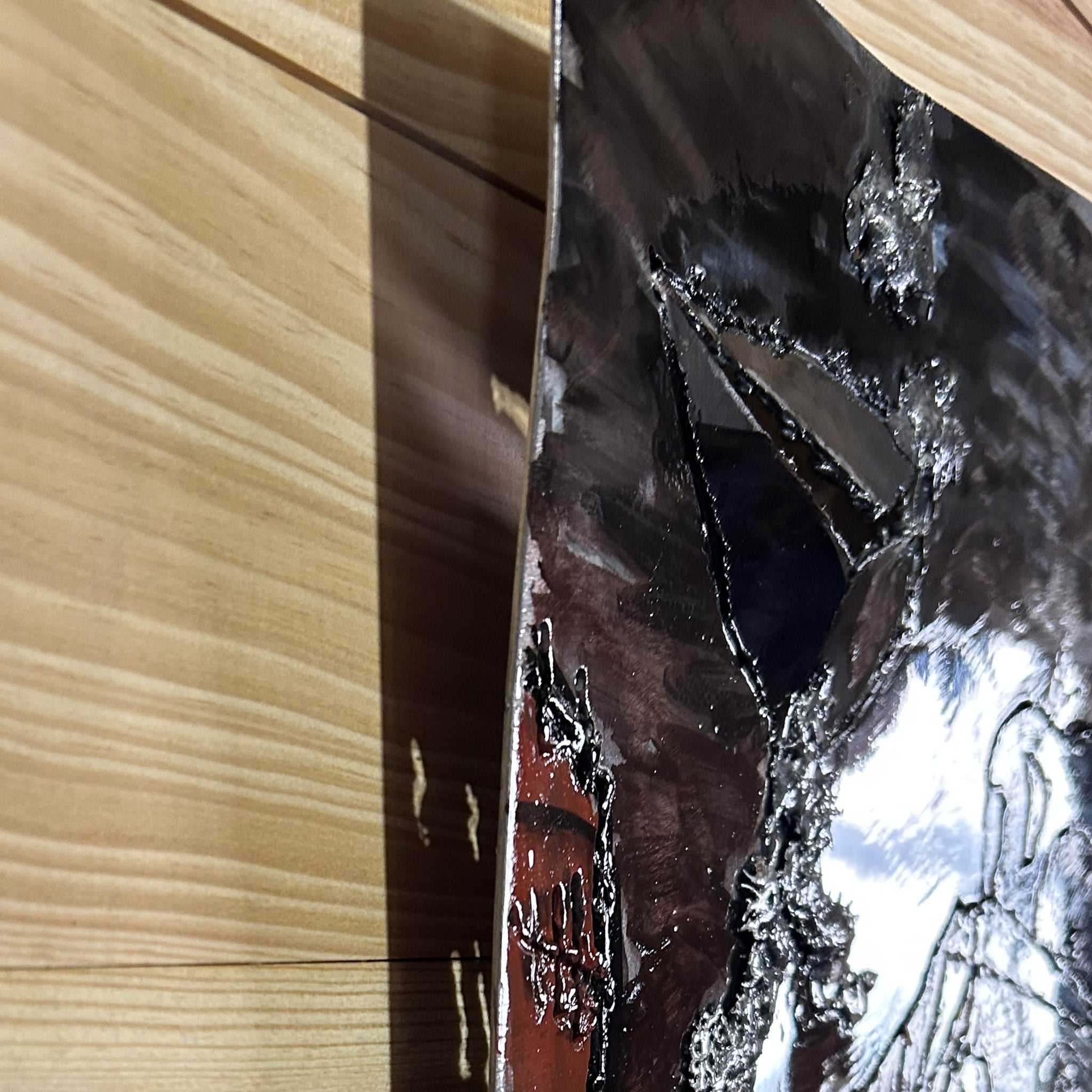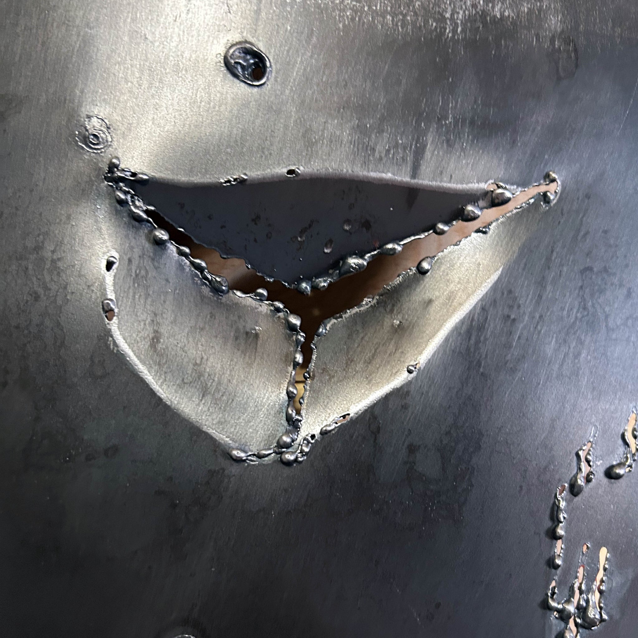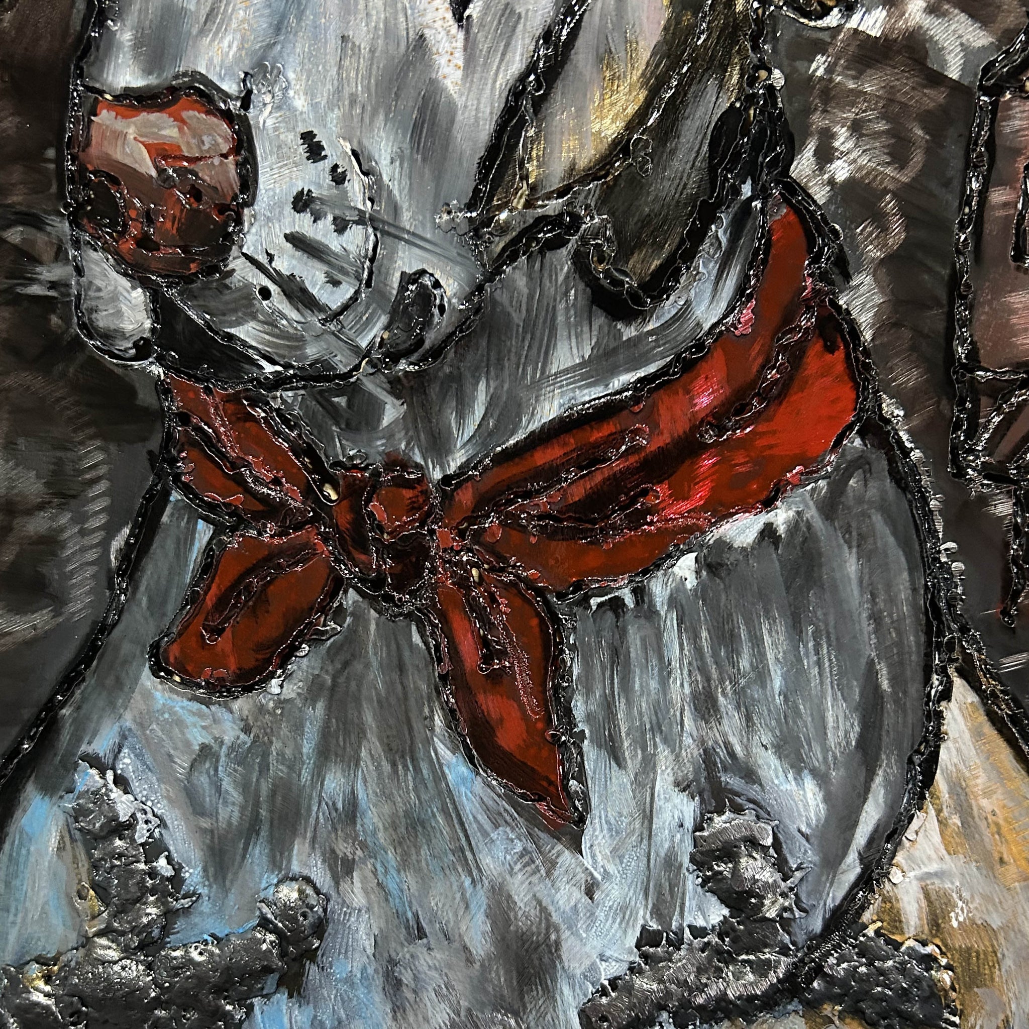 Текстурированный фон и подчеркнутые объемы создают скульптурное присутствие, сочетая силу металла и чувствительность художественного жеста.